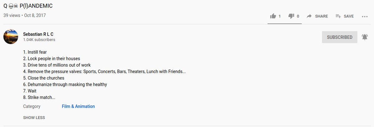 The oldest video is at the bottom: Riots = Soros Obama from Oct 9, 2017. The second oldest video is called P(l)ANDEMIC which brings me to the second reason I can be confident this was another channel of communications from Q: he predicted future events in geopolitics.